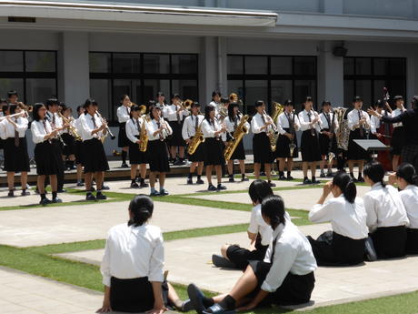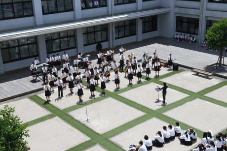 山城祭では開会式で書道パフォーマンスを行います。自分たちで選んだ曲に合わせて、特大筆で揮毫します。当日の数分間のために春から構想を練り準備し、暑い書道室でひと夏かけて練習をします。一緒に活動できる仲間を募集しています!