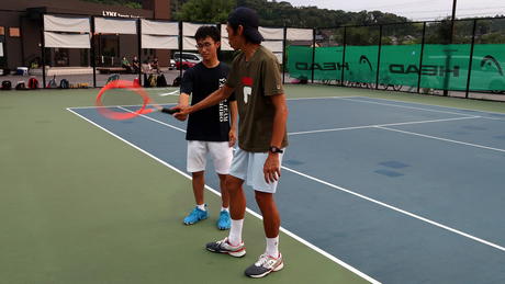 その後はオンコートで試打ラケットを使っての打球感の違いを確認しました。フォームや体作りだけでなくテニスギアにもこだわりレベルアップを目指します。