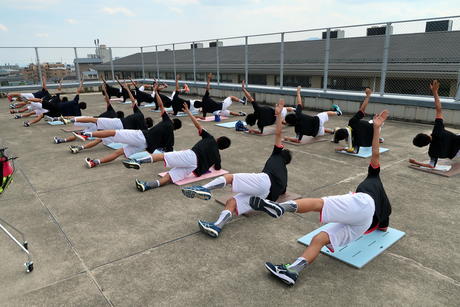 体育館の屋上にオムニコートを有します。平日放課後はソフトテニス部,テニス部女子とで2面を共用し,休日は2面3時間の練習を行います。コートを使用できない時間はトレーニングやランニングを行います。