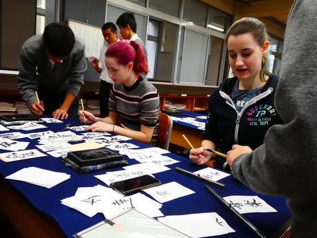 留学生たちは、山城高校の生徒たちに漢字を教わりながら、筆を走らせました。