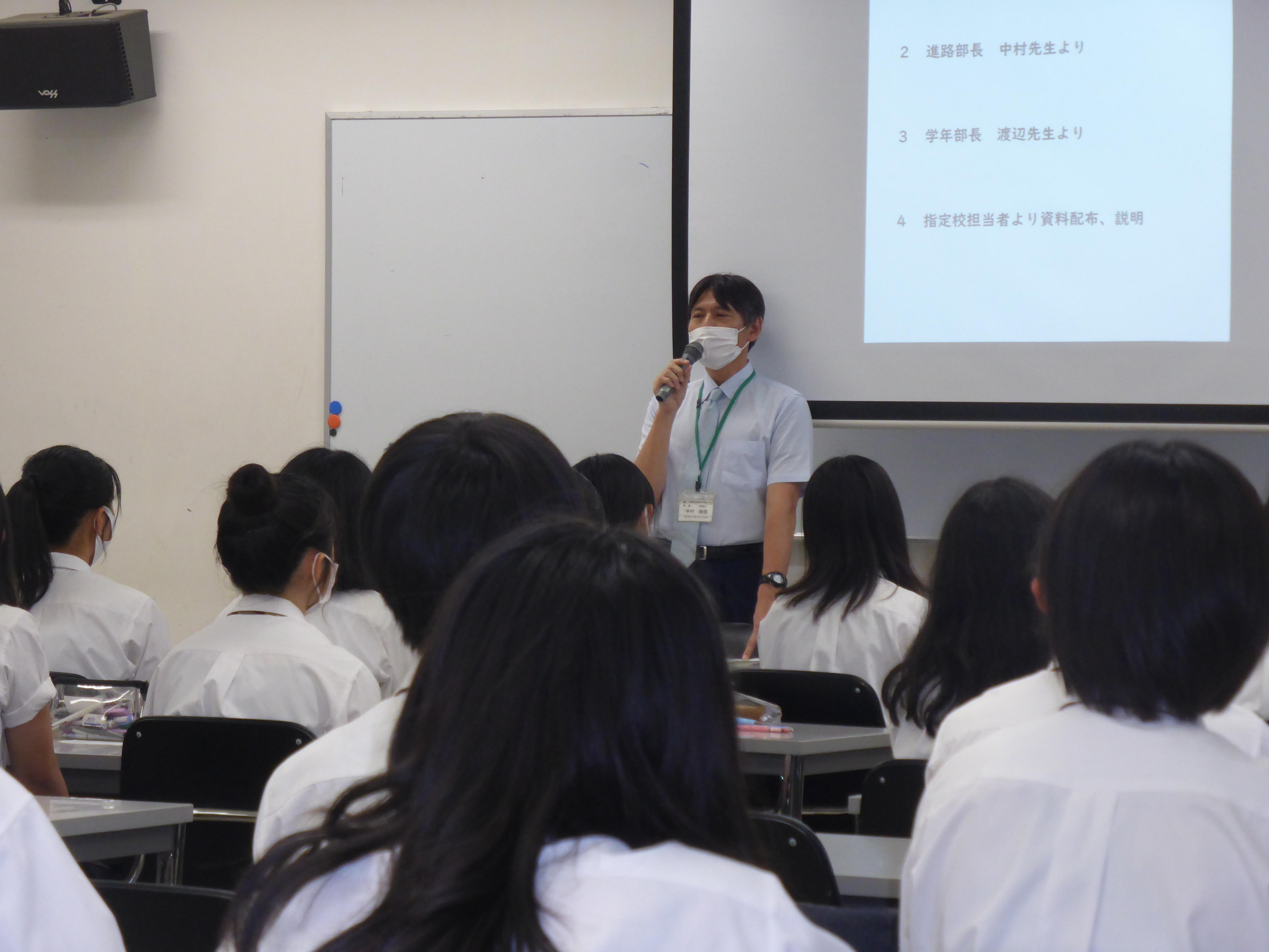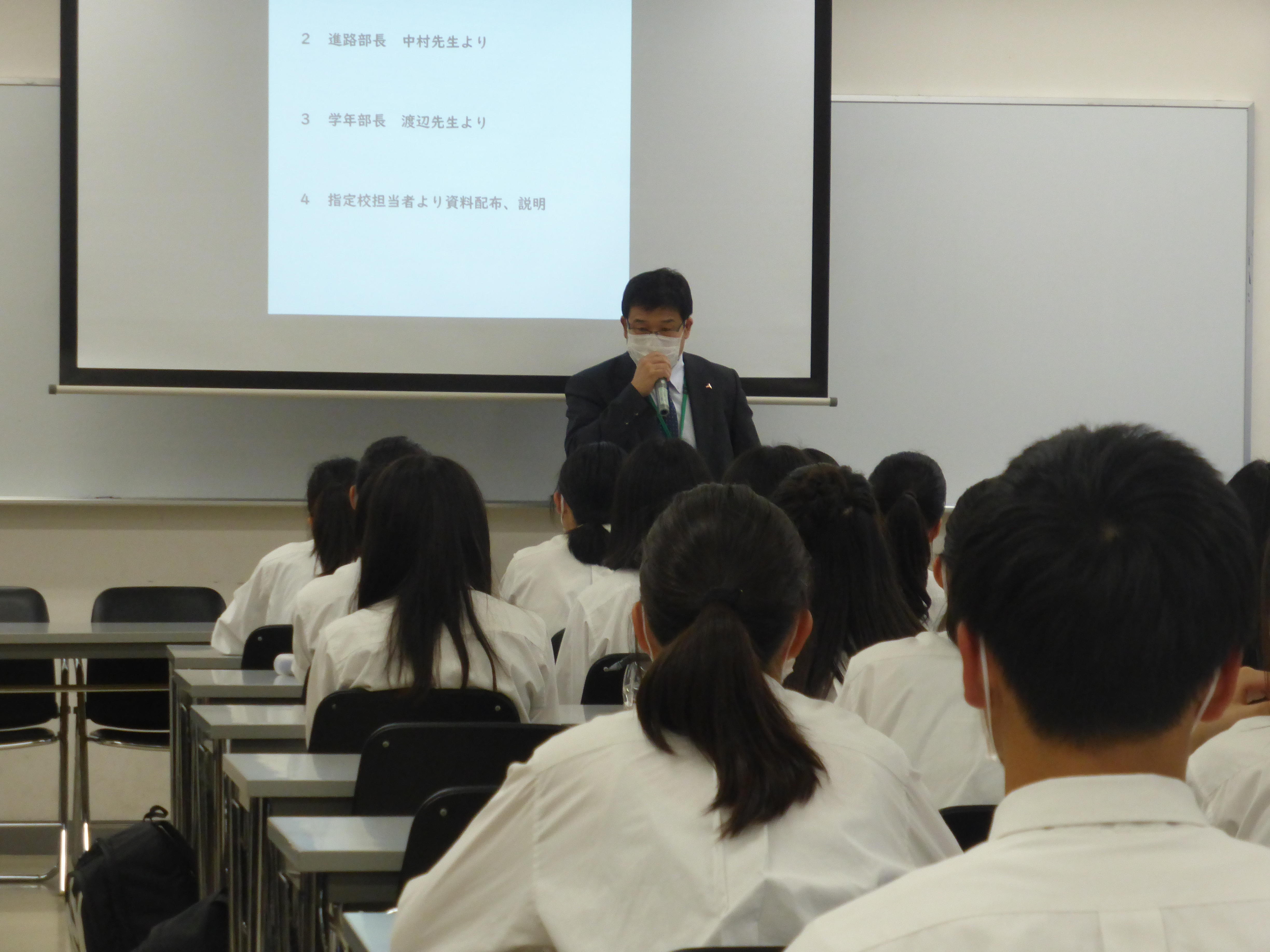 7月15日(水)、期末考査最終日に『国公立大学 総合型選抜・学校推薦型選抜ガイダンス』を実施しました。なお、昨年度は、国公立大学AO・推薦に20名の生徒が合格しました。今回のガイダンスには100名に近い生徒が参加し、一年間の流れや受験において大切なポイントなどを熱心に聞き入っていました。