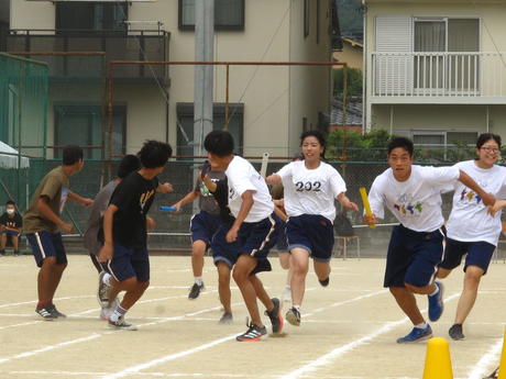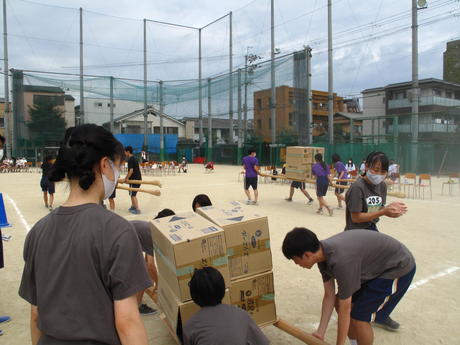 当日は、台風の影響もほとんど無く過ごしやすい気候となりました。生徒たちは、大箱運びやキック&キャッチ、大縄跳び、リレーといった競技で大いに盛り上がりました。
