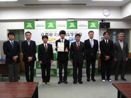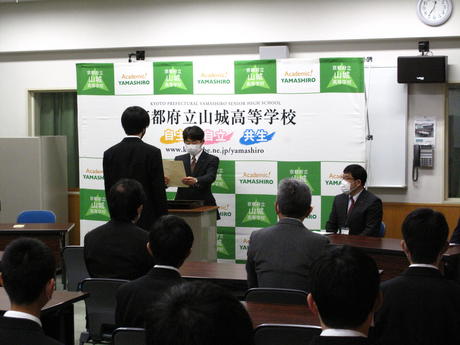 令和2年度グローバルネットワーク京都論文コンテストにおいて、2年文理総合科の八田慎之亮君の論文『包装容器等ゴミ問題の現状と解決に向けての展望』が佳作に選ばれました。今年度はグローバルネットワーク京都に参加する府立高校9校が集まり実施される交流会が中止となったため、京都府教育委員会高校教育課より4名にお越しいただき、校内で表彰式を行いました。表彰式には1・2年文理総合科の生徒をはじめとする20名程度が参加し、八田君の受賞を称えました。講評ではゴミ問題に対する提言についてオリジナリティがあることや、論文全体を通して十分な根拠が示され、論理に一貫性があることを褒めていただきました。今後も生徒達が論理的に考える力や表現力などを伸ばし、グローバル社会の一員として活躍できるようになっていって欲しいと思います。