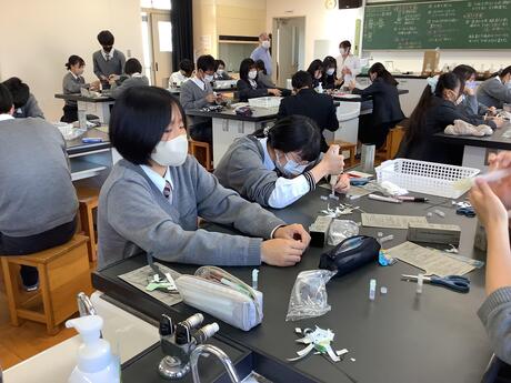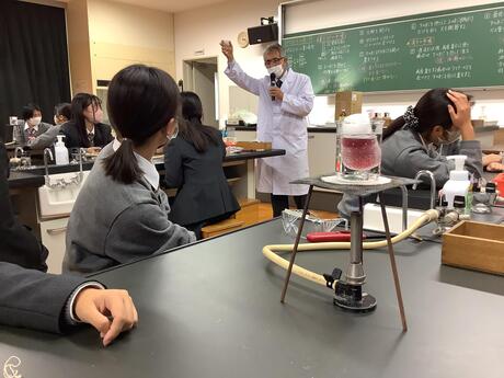 11月19日土曜日2年9組の生徒が京都府立大学・学長特別補佐生命環境科学研究科・教授 石田昭人先生の2回目の特別講義を受けました。午前中の講義は、まずは「色」に焦点を当て、「色」を測る、創る技法を実際に器機を使って示していただきました。そして、ものを測ることができるということは創ることができるという話になり、「心」の創り方の中で現在のAI技術の現状やその中で注意しなければならないことなどにまで及んで話していただきました。午後は「薄層クロマトグラフィー」という手法で葉をすりつぶして、色素を見る実験をしました。その後生徒は「色」について準備したプレゼンテーションをし、先生から講評をいただきました。