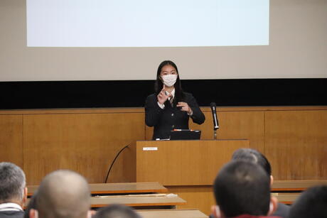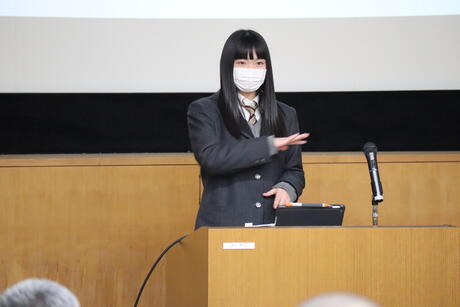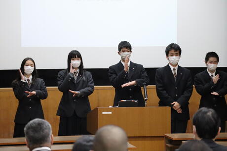 令和4年12月14日(水)、手話弁論大会を実施しました。出場した手話部の生徒3名は、自分で立てたテーマに対する思いや考えを熱く主張しました。主張に合わせて手話をするだけでなく、表情の変化をはっきり見せるといった工夫を取り入れており、聞き手がより理解しやすい主張となっていました。また、審査の間には手話部の生徒たちによる『ミニ手話講座』が開催され、手話にあまり馴染みのない生徒も気軽に手話を体験することができました。今回の手話弁論大会を通して生徒たちが、多くの人に考えや思いを伝えられるようになるとともに、誰にとっても伝わりやすい工夫を意識することの大切さについて理解を深めてくれたらと思います。
