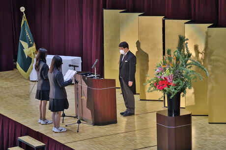 卒業生代表による答辞では、コロナ禍という先行きが全く見えない状況の中で、入学当初から休校を強いられ、いつ自分たちの活動が突然断ち切られるかわからない不安を抱きながらも、自分たちなりの高校生活の形を探し、全力で楽しんだことが伝わる答辞でした。