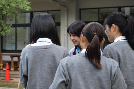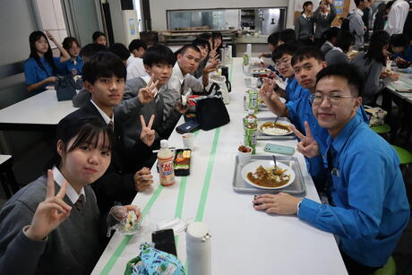 お昼には本校食堂で一緒に昼食をとりました。その後、中庭にて自己紹介や歌の披露、本校生徒との交流を行いました。