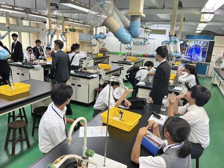 体験授業ではまず全員で、化学で紫外線照射の実験で、紫外線によって鉄イオンの反応を学びました。