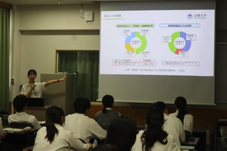 京都大学在学の後藤荘子さん(経済学研究科経済学専攻博士後期課程)にお越しいただき、文理総合科第2学年の生徒を対象に、「食品ロスを減らす施策」というテーマで御講義いただきました。