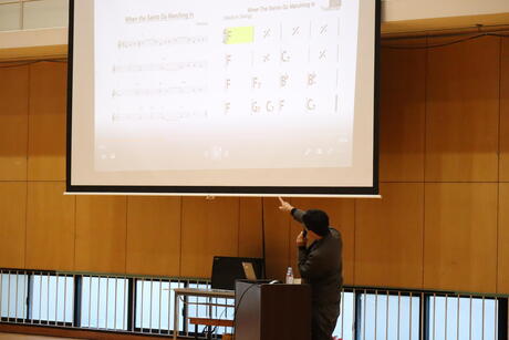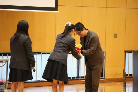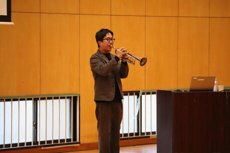 今年度は、トランペット奏者の 谷殿 明良 様(第54回(平成14年3月)卒業)にお越しいただき、『ジャズを学んだ私から皆様へ。』という演題でお話しいただきました。国や年齢を越えて人と繋がることができる音楽の素晴らしさや好きなこと対して真っ直ぐに向き合う楽しさなどをトランペットの実演や御自身の留学の経験談を交えながら御講演いただきました。