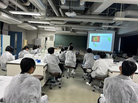 令和6年11月16日(土)、文理総合科の2年生を2グループに分け、まず21名が京都府立大学を訪問し、田中 俊一 准教授(京都府立大学 生命環境学部 生命分子化学科 生命構造化学研究室)の遺伝子組換えに関わる特別講義を受け、実験を行いました。