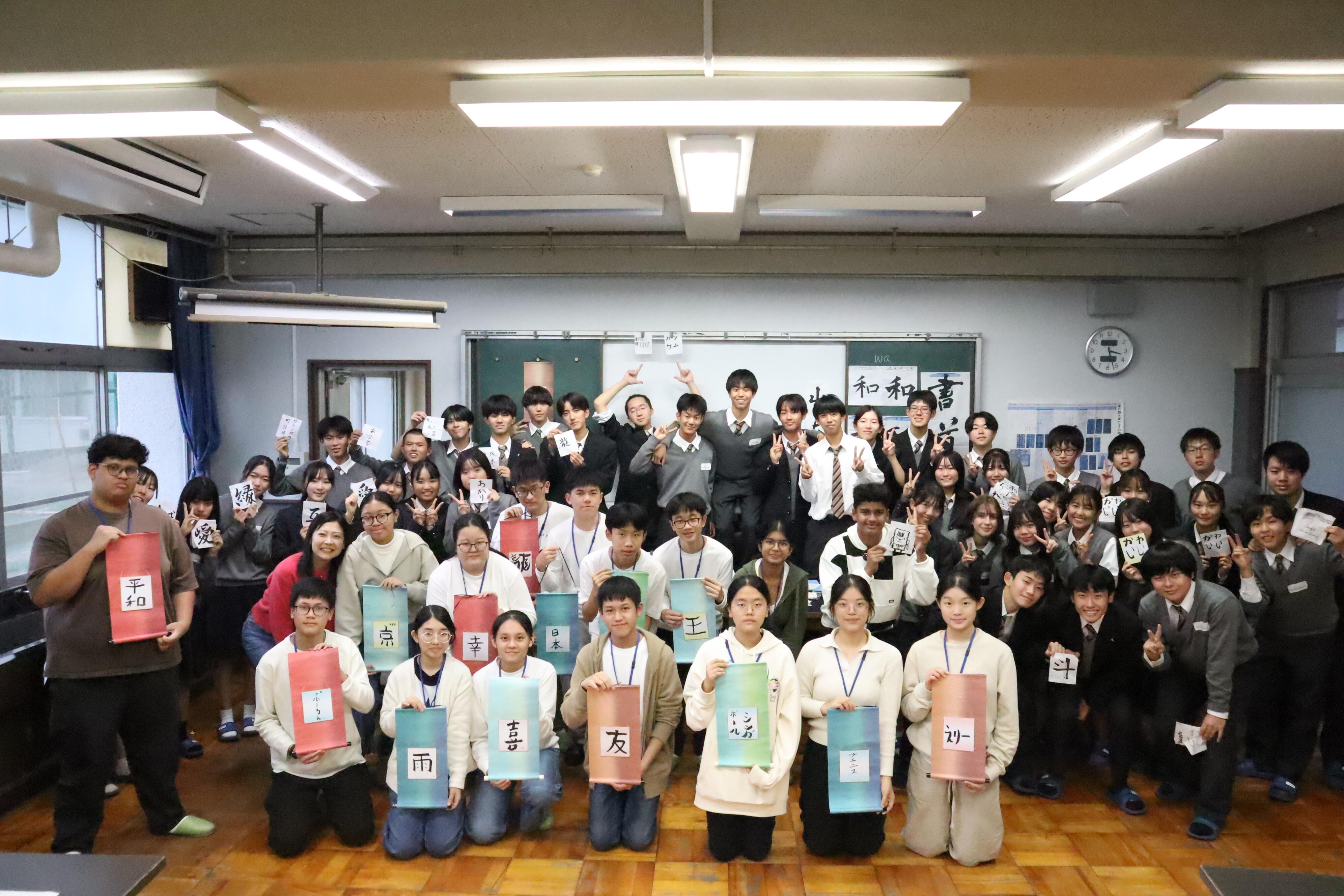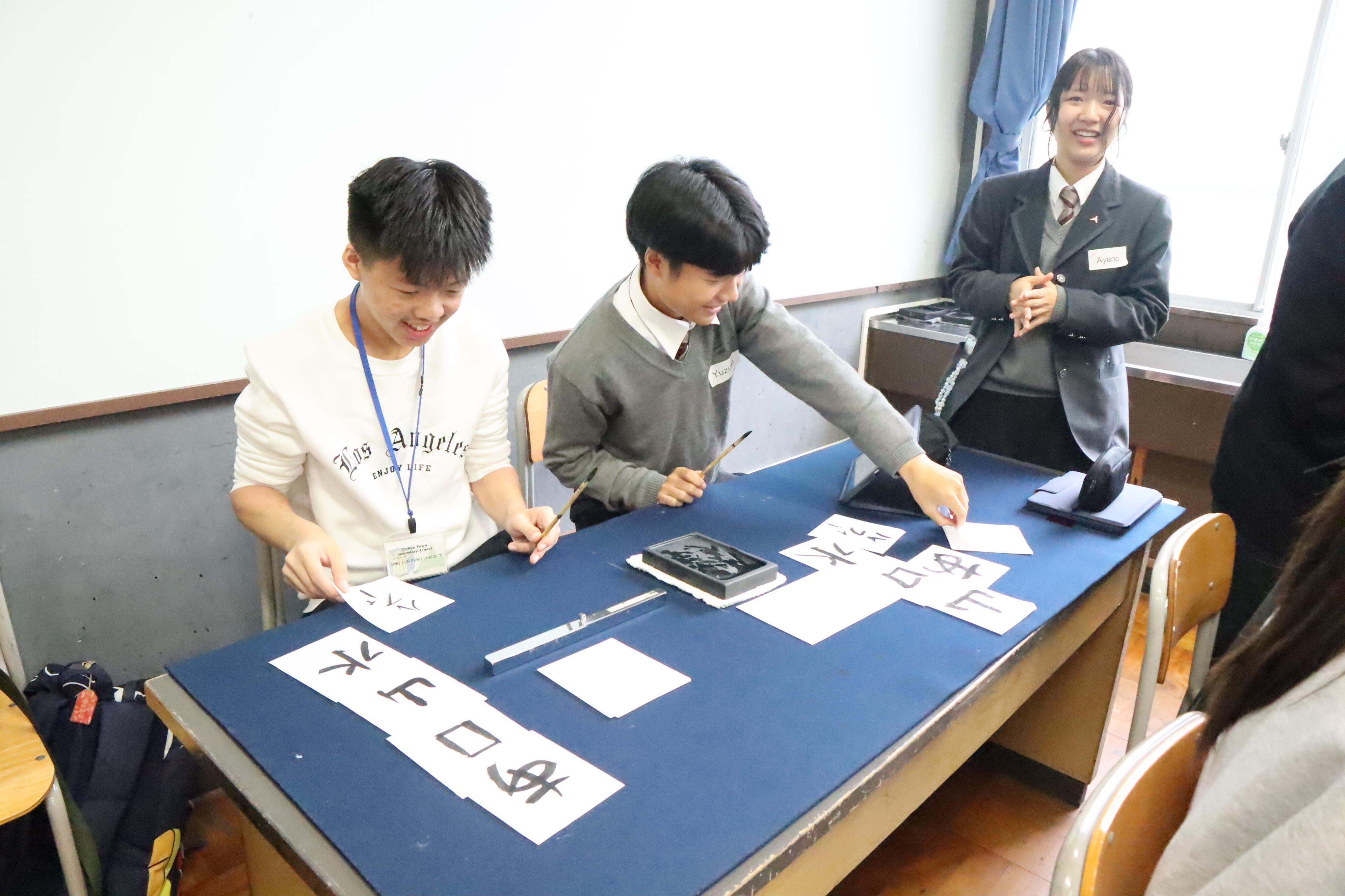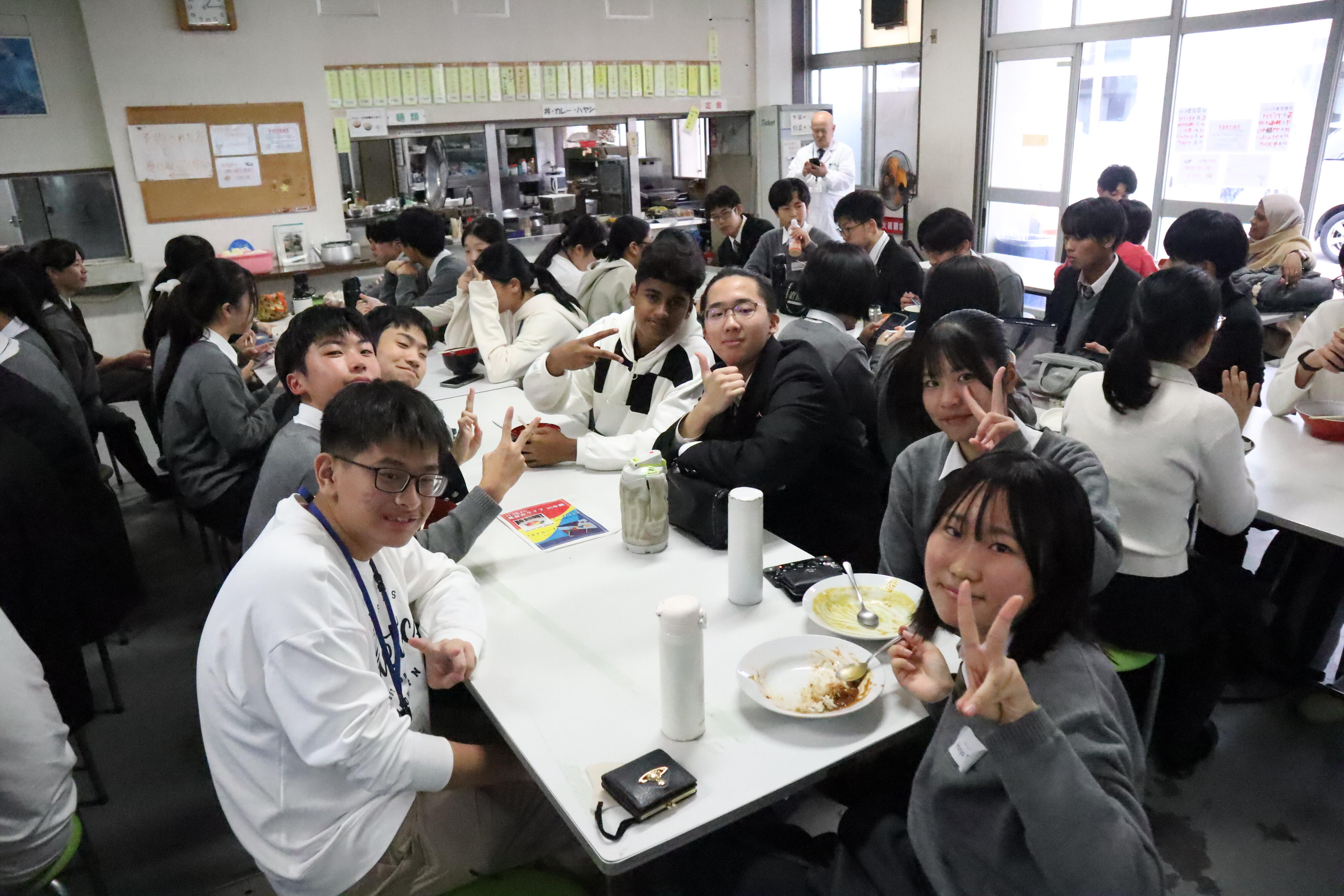 令和6年11月15日(金)にワールドワイドパイオニア育成プロジェクトの一環として、シンガーポールのイーシュンタウンセカンダリースクールから32名の生徒が来校し、国際交流を行いました。歓迎セレモニーの後、本校1年の文理総合科、2年の文理総合科・普通科の生徒と共に、書道体験や調理を交えた実験・グループ交流などを通して、親睦を深めました。また、お昼休みには本校の食堂で一緒に昼食をとり、軽音楽部による昼休み公演を楽しみました。